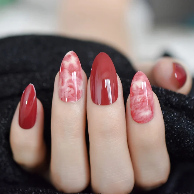 Printed Stiletto Fake Nails Red Wine Marble Nails Sharp Image