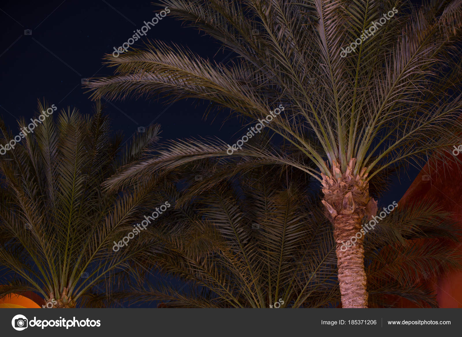 Decorative Luminocity Palm Trees At Night Sky Background In Egypt